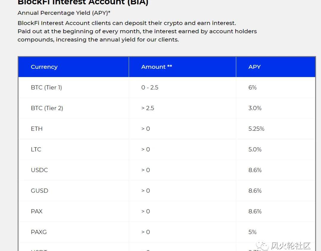 一個是blockFi,這兩年崛起的頗有名氣的海外加密借貸公司,10月27日更新的數據是持有2400多萬GBTC,排名第一占總量差不多5%。據blockFi官網信息,目前存入利率如下,比特幣的年化是3-6個點: