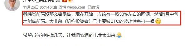 事實證明,江老師是真正有水平的。11月26日,江老師發微博稱,現在開始,應該有一波30%左右的回調,然后1月中旬才能破前高。大韭菜馬上要被BTC的波動性打一頓。今天的事情大家都知道了,江老師對此是這么說的,“跌幅20%確實沒到30%,但我都說了,短線問上帝,我又不是上帝,能猜中暴跌時間就不錯了”。確實,江老師又不是上帝,能猜中暴跌就不錯了,江老師是有水平的,江老師都猜中暴跌了,江老師真的很厲害了,你做波段做飛了吧,哈哈哈!!!