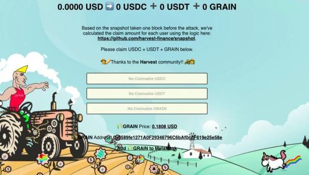 12月7日,一站式收益耕作DeFi平臺HarvestFinance上線了索賠門戶網站,用于賠付1個月前因閃電貸攻擊遭受損失的用戶。據Harvest公布的數據,攻擊者已將248萬美元返還給部署合約,這使得用戶受損資金減低到15%~13.5%。Harvest想通過USDC、USDT和GRAIN代幣來補償此前受到影響的用戶。在官方公布的索賠網站中,受損用戶完成登錄后,便可收取USDC、USDT兩種穩定幣和新幣GRAIN。