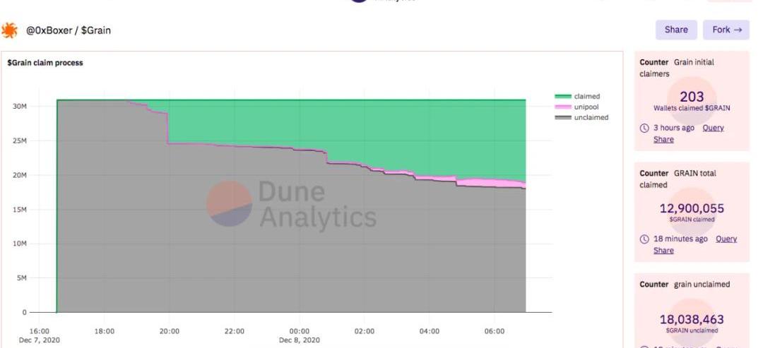 根據GRAIN實時領取數據,截至12月8日下午3點,已有203個地址收取了GRAIN,索賠進度完成約1/3。