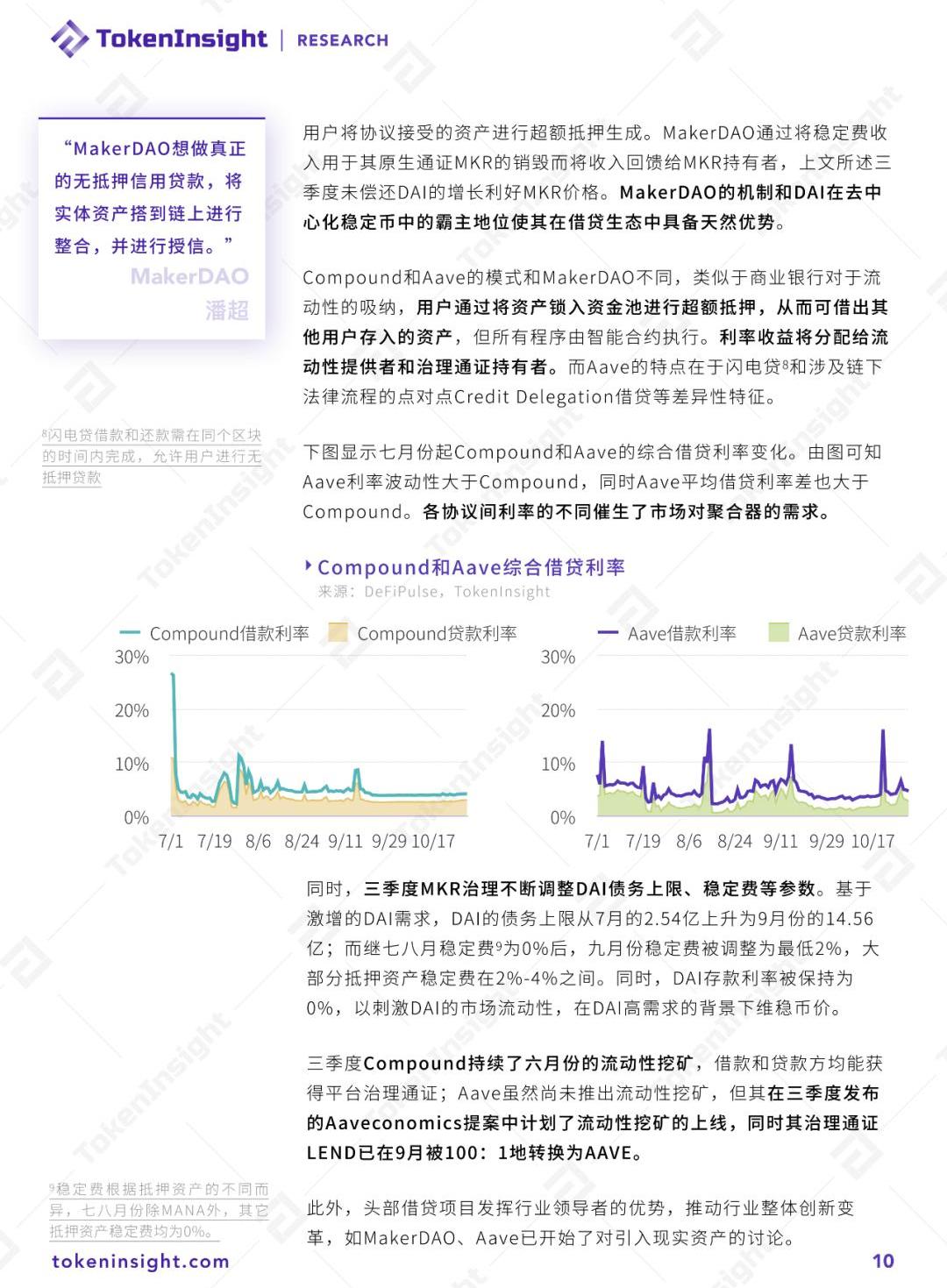 1.借貸領域季度末鎖倉值較季度初增長294%,清算額為二季度的10倍;2.九月下旬起MakerDAO表現強勢,重回鎖倉值榜首,借貸壟斷程度低于DEX,且整體行業已能夠產生較為穩定的現金流;3.第三季度以太坊上去中心化穩定幣發行量占比上升4.18%,DAI的發行量上漲527%,發行量在10月底達9億美元;4.DAI、USDT、USDC為DeFi中未償還債務最高的資產;5.WBTC鎖倉量可以頭部DEX和借貸項目媲美,九十月份鎖倉值變化遠優于DeFi整體水平;6.聚合器yearn.finance第三季度鎖倉值翻97倍,YFI價格上線僅兩周價格超過比特幣,成為最貴的數字資產;7.預言機維持“一超多強”競爭格局,DeFi發展直接影響預言機使用量;8.資產管理類項目收到流動性挖礦和收益聚合器項目崛起的沖擊,資管協議鎖倉值占比持續下降;9.其它公鏈積極建設DeFi,但以太坊DeFi生態仍舊占據絕對優勢。