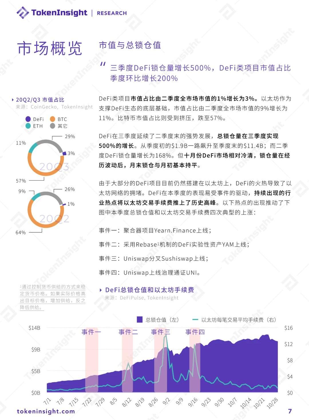1.DeFi在三季度發展依舊強勢,總鎖倉量較二季度增長500%,達$11.4B。十月DeFi市場相對轉冷,月末鎖倉量與月初基本持平,DEX整體交易量回落,十月下降34%;2.DeFi的火爆將以太坊手續費推上9月初平均$14/筆的歷史高峰,DeFi表現受yearn.finance等熱點項目和事件驅動明顯;3.預言機項目Chainlink長期位居DeFi市值榜單第一。市值前十的DeFi項目平均回報率為89%,半數表現超以太坊;4.AMM驅動DEX交易量增長,三季度DEX總成交量達$47B,為歷史總成交量的4.2倍,較二季度環比增長1,155%;5.收益農耕帶給參與者的高收益在短時間內吸引了大量流動性和用戶,但農耕收益下降是必然趨勢,熱度褪去流動性增長也逐漸停滯;6.分叉項目發展初期與原項目搶奪市場,呈現“此漲彼跌”的趨勢,但長期來看難以對原項目產生本質上的地位撼動;7.衍生品領域仍由合成資產主導。整體鎖倉值較二季度增長169%,達$293M,占DeFi總鎖倉值比例由季度初的15%下降至季度末的7%,九月下旬熱度退潮趨勢較借貸和DEX明顯。