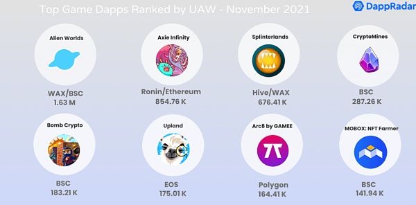 其他區塊鏈游戲的發展也很不錯,比如 Splinterlands 和 Alien Worlds 繼續在鏈游市場保持主導地位,而 CrytpoMines 和 Mobox 則鞏固了它們在幣安智能鏈上 GameFi Dapp 的頭部地位。