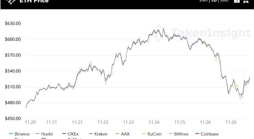 ETH近7日價格,來源:tokeninsight.com本周三,以太坊2.0啟動門檻的質押量以驚人的速度,成功達標。標志著,不出意外的話,以太坊2.0將于12月1日正式上線。隨之,ETH的價格也飆升至兩年來的新高$620,在11月24日當天,ETH現貨交易量超過了BTC交易量的2.5倍之多,ETH-USDT的交易對的交易量在一天之內達到了近30億美元。市場情緒也一哄而起,被推向高潮。然而,歡樂的時光總是過的特別快。牛市之后,不到兩天,截至本周五,ETH價格急劇下跌了近25%,由接近$600的價格暴跌至$480附近,并伴隨著大幅波動。價格的下跌可能與以太坊2.0的投票情況有關。