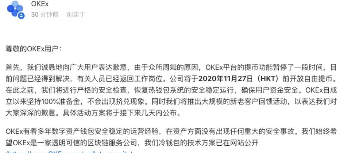 來源:微博盡管JayHao、徐坤等OKEx高管一再表示平臺正常運轉,將盡早開放提幣,卻依然無法打消外部猜測,畢竟用戶投入的是真金白銀,非主觀原因被限制提幣自然有怨言。如今,OKEx官方承諾將在11月27日前開放提幣,不僅能讓這些用戶暫時安心,也意味著此前爆出的各類市場傳言不攻自破。事實上,我們從行業媒體的公開報道中,也可以推斷出OKEx平臺內部運轉正常,因為該公司團隊在安撫用戶的同時,還在正常推進相關業務,比如以下兩項工作便有據可查:——10月28日晚,OKEx率先發布針對BCH分叉的處理方案,將對BCH賬戶進行快照并空投;11月19日,OKEx已將BCHABC的代幣BCHA已經按1:1空投到用戶資金賬戶。——據OKB生態建設10月月報顯示,此前市場較為關注的OEC進展順利,具體體現在OEC流動性挖礦farm模塊開發完成100%、Swap模塊一輪測試完成100%、EVM智能合約開發完成30%等。綜上所述,OKEx相關業務不僅沒受事件影響,相反還在穩步推進,用戶大可不必再為資金安全擔心。信號2:OKEx準備金充足,不會出現擠兌現象