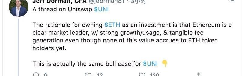 UNI經常被誤稱為“治理”代幣,而市場則認為“治理是沒有價值的”。但實際上,UNI是一種pass-thru代幣,意思是其收入將傳遞給代幣持有者,UNI代幣持有人將在2021年2月獲得非常豐厚的收入流。而所有的治理代幣,最終都需要成為價值傳遞代幣,這就是投票至關重要的主要原因——引導資金流動。在一個很難實現真正增長的行業,看空這種增長的項目似乎是瘋狂的。