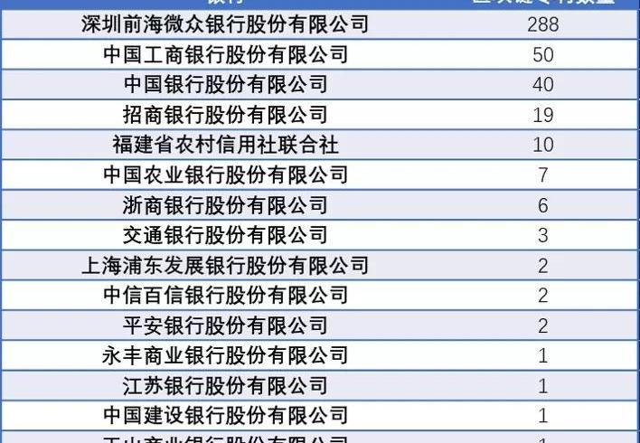 圖3:13家銀行備案信息申報數量資料來源:網信辦,01區塊鏈據01區塊鏈《中國銀行業區塊鏈應用與探索報告》,從2018年開始,我國銀行業區塊鏈相關實踐的業務格局逐漸形成,大型國有銀行和股份制商業銀行開始占據中國銀行業區塊鏈實踐的主力位置,并逐漸與民營銀行、城商行等其他類別銀行拉開差距;民營銀行及城商行2019年在區塊鏈相關領域的探索頻率出現較大幅度增長。從2019年中國銀行業區塊鏈實踐場景分布情況來看,銀行區塊鏈實踐集中在銀行中間業務。其中,供應鏈金融、貿易融資、跨境金融等場景占比過半,是當前銀行業區塊鏈業務的主要領域。除了備案申報信息以外,中國銀行業穩步推進區塊鏈技術研究,區塊鏈專利逐年上升。根據01區塊鏈統計,截至2019年12月,我國共有15家銀行申請了區塊鏈技術相關專利,專利申請數量合計達到433件。專利申請數量最多的三家銀行分別是微眾銀行、工商銀行和中國銀行,其數量分別為288、50和40件。表4:銀行區塊鏈專利申請情況