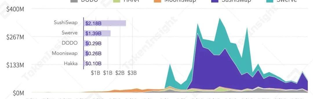 20Q3新上線去中心化交易所成交量,來源:DeBank,TokenInsight另外,多個新玩家在本季度入場。其中Sushiswap作為Uniswap的分叉,因推出治理通證和引入流動性挖礦,一經上線便受到市場的熱烈關注,搶奪Uniswap的大量流動性。而后者則在9月份同樣推出了治理通證,鞏固了其領先的市場地位。和中心化交易所相比,去中心化交易所行業整體尚處于發展早期,但行業競爭格局已有初步奠定之態,而巨大的行業增長和新玩家的紛紛入場則顯示了去中心化交易所行業良好的未來潛力。