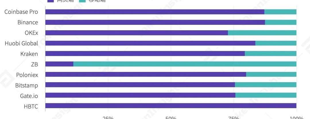 2020Q3各交易所季度訪問量占比情況,來源:Similarweb;TokenInsight5.2網頁、移動端和排名分析在所有被調查交易所中,絕大部分交易所網頁端用戶遠高于移動端用戶,HBTC由于未上線移動端所以網頁端數據占比即為100%。Binance、CoinbasePro和HuobiGlobal網頁端用戶均超過80%,其余交易所網頁端占比平均在75%左右,而ZB交易所網頁用戶僅占居11%。