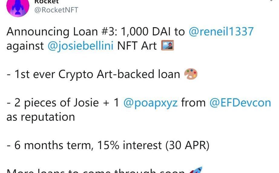 甚至不乏個別突破邊界的創新,NFT+DeFi的嘗試就開始涌現,最有代表性的莫過于NFT借代平臺RockerNFT,其采用去中心化自治組織結構,允許用戶抵押NFT借出DAI。其中藝術家JosieBellini創作的NFT藝術作品就RocketNFT上抵押,并借出了1000DAI,期限為6個月,利息15%,成為首筆基于藝術作品的去中心化抵押借代。當然目前更多也只是試水階段,畢竟NFT的公允市場定價較難,所以這象征意義濃厚的第一筆1000DAI的NFT抵押借代,“信譽”起到了關鍵作用。