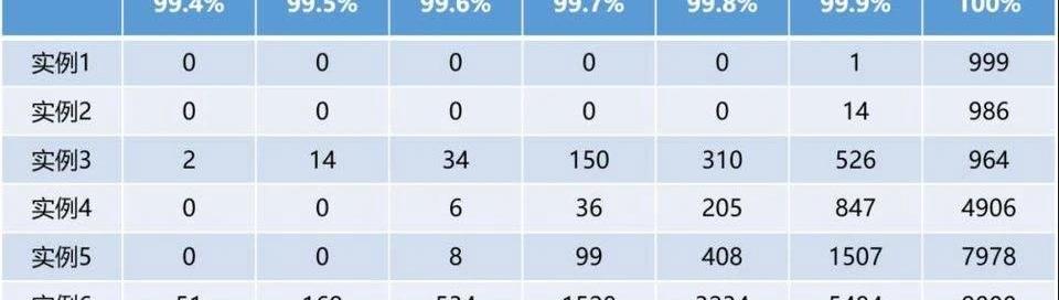 表3這里我們定義見證率為在一段時間內被包含的見證數除以被分配到見證數。不難看出,總體來說,隨著驗證人數量的上升,見證率會下降。但在實例3中,雖然驗證人只有2k,但見證率卻比6k甚至10k的見證率都要低。為了探究導致實例3總體見證率異常的原因,我們統計每個實例里驗證者的見證率加以分析,看是否由于個別驗證者出了問題拉低總體比例。我們將每個驗證者比例按照范圍劃分,得到以下數據: