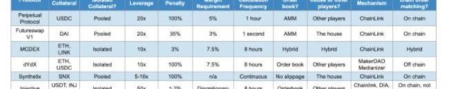 目前已經有一些DeFi結構可用于生產合成金融結構,而每一個都各有利弊。1、Maker、Kava、比特股-抵押品支持資產+預言機在這種結構中,用戶從資產池中提取債務。債務是合成的,為了管理創建、贖回和清算,系統就需要用到外部預言機。這是最簡單的合成資產建設。包括Maker和比特股都采用了這種模式。而使用小市值資產作為抵押品的協議,必須要求更高的抵押比率來應對波動風險。優點:簡單,集中流動性;缺點:資本效率不高,可用杠桿率有限,需要外部預言機,由于缺乏套利循環,無法維持住錨定。2、UMA+無價合約與上面的構造類似,交易者存放抵押品,并針對抵押品提取合成頭寸。然而,這種無價合約的構建在幾個方面是有所不同的:頭寸不必完全抵押,外部預言機的使用,被一種加密經濟游戲所取代,這種游戲可激勵交易者和清算人不對資產價格撒謊。UMA為實例化合約和解決價格糾紛提供了一個通用框架。然而,UMA不是一種產品,有少數團隊已在UMA上開發產品和服務,其中包括Potion和Jarvis。優點:更高的資本效率,幾乎可以推廣到任何資產,債務風險僅限于一個抵押品池;缺點:預言機博弈輪是一種新的未經檢驗的理論,預言機速度慢,不能用于實時級聯清算,流動性是分散的。3、Augur、Gnosis、Polymarket和Flux-預測市場預測市場提供了對未來事件結果進行推測的能力。其中最常見的例子就是二元期權:體育、、月末/季度/年度價格預測。例如:“當市場在2020年12月31日收盤時,特斯拉的股票價格會高于2000美元嗎?”像Augur、Gnosis、Polymarket以及Flux都采用了這種模式。優點:資本效率高,針對、體育及EOY價格預測等事件進行了優化。缺點:需要一個外部預言機,很難構建一個簡單的合成資產來反映基礎價格的100%變動,杠桿率有限且相對不靈活,流動性集中度較低。4、Opium-現金結算期貨在這個模型中,交易者將保證金轉到一個智能合約上,然后買入或賣出在某個特定時間結算的期貨合約。期貨價格在結算時會收斂到基礎指數價格,因為有套利交易,它會買入現貨,賣出期貨,反之亦然。Opium在其期貨合約中使用了這種模式。這種模式與舊世界金融市場的傳統期貨合約非常相似。優點:簡單易懂,資本效率高,提供很高的杠桿率,允許期權做市商對沖頭寸,允許礦工鎖定對沖期限;缺點:將流動性分散在不同的到期日,需要外部預言機,不一定在合約期間跟蹤指數價格;5、Synthetix-基于債務池的永續掉期永續掉期交易者是與SNX債務池進行交易,因此,與傳統的永續交易模型不同,交易者不需要等待交易對手來匹配他們的交易。多頭和空頭并非總是平衡,這意味著多余的資金會支付給SNX質押者,以彌補交易一方比另一方更有利可圖的風險。只有增加多頭和空頭之間偏差的交易者才會支付交易費用。優點:交易者不需要等待交易對手,提供了很高的杠桿率,保證了流動性,不需要做市商,易于引導流動性;缺點:資本效率低下,如果交易者獲利,SNX質押者將陷入困境;6、永續協議——基于虛擬自動做市商的永續掉期交易者將抵押品存入智能合約,他們通過聯合曲線上下交易合成資產。融資利率由外部預言機設定的標價與指數價格之間的差值決定。k的算法設置是交易量、未平倉量及其他變量的函數。請注意,在這個模型中,是沒有maker的,所有人都是taker,永續協議就是采用的這個模型。優點:簡單易懂,資本效率高,提供了很高的杠桿率,保證了流動性,集中了流動性,不需要maker,易于引導流動性;缺點:需要一個外部預言機來確定融資率,需要一個資本充足的保險基金。7、DerivateX、dYdX、MCDEX以及Serum——中心限價訂單簿永續掉期交易者將抵押品存入智能合約,流動性提供者在CLOB上發布限價單,taker則跨越價差。DerivateX、dYdX以及MCDEX采用了這種模式,并在以太坊上創建了一個鏈外CLOB。而Serum項目也采用這一模型,并在Solana上建立了鏈上CLOB。優點:易于理解,資本效率高,提供了很高的杠桿率,提供了最緊密的點差,集中了流動性;缺點:難以引導流動性,因為它需要成熟的做市商,此外,它也需要資本充足的保險基金,以及需要外部預言機來確定融資率。探索非托管永續掉期