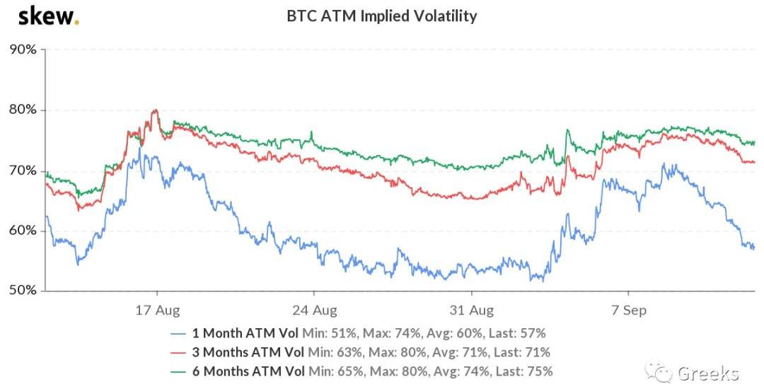 各標準化期限隱含波動率:今日:1m58%,3m72%,6m75%9/11:1m63%,3m74%,6m77%比特幣日波動連續多日都比較小,實際對沖RV成本極低。對于我們,不同周期之間的IV開始拉開差距,價差已經達到了很高的水平。