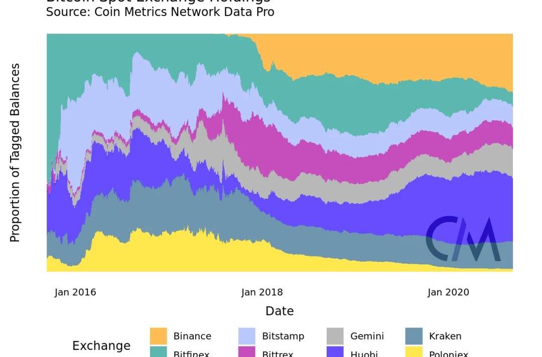分析市場集中度的一個有效指標是Herfindahl-Hirschman指數,該指數隨著市場的壟斷性的增加而增加。雖然我們的估計會受到幸存者偏差的影響,但在過去一年中,CoinMetrics覆蓋范圍內的BTC/美元現貨市場的HHI一直保持平穩。目前,根據這一指標,我們認為市場是適度鞏固的。除了報告的交易量外,鏈上持有量還可以從另一個角度窺見行業狀況。CoinMetrics的交易所流量所追蹤的現貨交易所的比較余額如下所示。由于Coinbase避免了熱錢包地址的重復使用,這些估計中明顯不包括Coinbase。