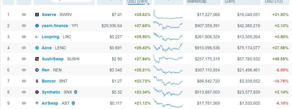 XRP/HKD-3.97%近日的DeFi有所復蘇并非是印象流,有很多地方可以體現DeFi可能迎來二次巔峰。首先便是體現在幣價上,昨天DeFi領域在一天之內反彈了19%。根據Messari的數據,昨天在37個DeFi代幣中有32個在上漲,漲幅在3%至39.6%之間。