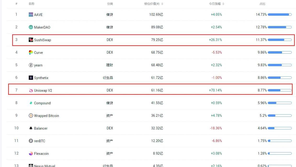 這些上漲中有些是我們熟悉的幣種,如YFI,上漲了37.65%,還有Sushi上漲了27.84%,還有近日從Curve分叉而來的Swerve,漲幅更是將近40%。價格恢復是DeFi有所復蘇最直觀的體現,但亦有可能出現曇花一現或回光返照的情況,所以通過市場上關于DeFi的種種動作方能更好的判斷。其一便是前幾日對DeFi市場造成重大影響的Sushi已經遷移成功,用戶抵押在Sushi上面的Uniswap做市資金LP遷移到了SushiSwap上面。對Uniswap來說,簡直是被薅走了一層皮——鎖倉資金量減少了66%,等于少了11億多美金。