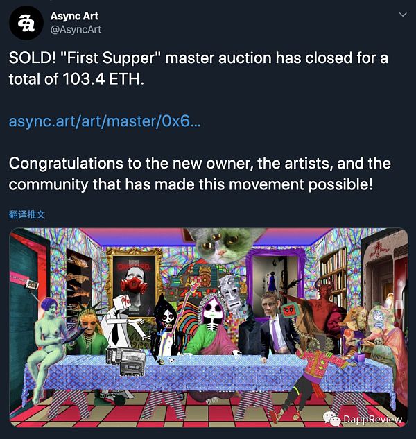 First Supper拍賣開始于UTC時間2月27日凌晨,28號晚上結束,最后階段,每有一位競拍者出價,倒計時自動延長五分鐘。在幾位競拍者將價格提至55.55ETH之后,只剩下Vincent和MetaKovan兩位競拍者繼續出價,價格迅速來到了Vincent出價的88ETH。MetaKovan人狠話不多,直接加碼到103.4ETH,此后Vincent再未出價,MetaKovan了結了這場漫長的拉鋸戰,贏得了此次競拍。MetaKovan后來在Discord群里說,他當時特意去看了Vincent錢包,發現只有99 ETH,考慮自己的幸運數字是34,所以干脆直接出價到103.4ETH的價格。最終該作品以103.4 ETH(時價約16萬人民幣)被MetaKovan拍中。