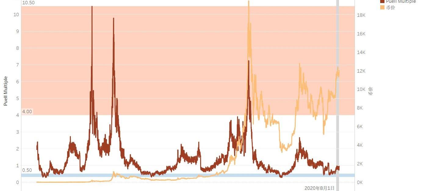 數據來源:QKL123,CFTC上圖為CME比特幣期貨持倉量與成交額,可看出其成交額呈現出波動狀態,但相對穩定,基本在6億美金左右。其持倉量在8月17日達到短期峰值9.5億后開始持續下降,于6億美元左右企穩,配合表3-9可看出資管方和杠桿基金減倉了超過3000個空頭頭寸,杠桿基金和其他兩類主體減倉超過2400個多頭頭寸。綜上,反映出即使在傳統金融市場(比特幣處于高位震蕩區),投資人對其多空態度也保持不一。3.4礦業生態數據圖3-10PuellMultiple與比特幣價格