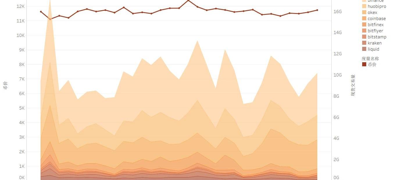 數據來源:QKL123(如4.5中圖4-9所示)上圖為四大期貨交易所8月持倉額與爆倉額概況。從持倉額上來看,可以8月19日為分界線將其分為兩個階段,在該節點之前哪怕歷經8月2日幣價急劇下跌市場持倉量依舊緩慢上漲,至8月19日(幣價創短期新高的后一日)達到短期峰值,之后隨幣價回撤而下降。從爆倉額上來看,8月整體市場整體情緒多為看漲,8月2日幣價急劇下跌導致市場多頭大規模爆倉,之后隨幣價上漲甚至創新高反而并沒有發生大規模爆倉;8月下半場幣價回撤,爆倉規模逐步縮小,結合持倉量可看出多頭持倉在逐步撤退。4.4現貨交易所圖4-8現貨交易所成交量