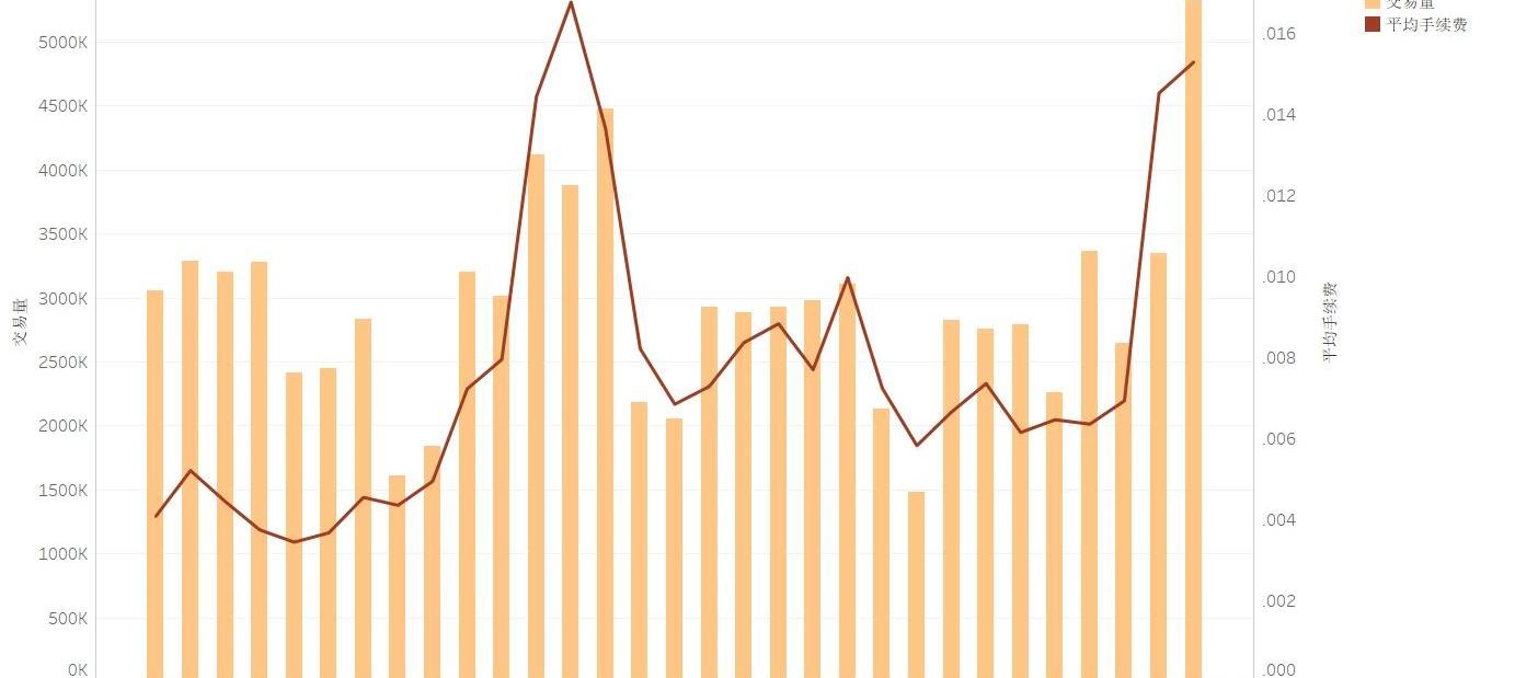數據來源:QKL123上圖為DeFi近一個月鎖倉額,涵蓋QKL123DeFi數據中心(如下文2.6圖2-8所示)26個項目數據。可以看出,DeFi鎖倉額8月整體呈上升趨勢,從月初開始鎖倉近4億美元,到月末已經超過8億美元,鎖倉量上漲超過一倍。DeFi鎖倉額是衡量DeFi行業發展的一個重要指標,但也從側面反映了DeFi行業泡沫的膨脹情況。2.5DeFi熱度分析ETH鏈上數據圖2-6ETH日均單筆gas費用與鏈上交易量