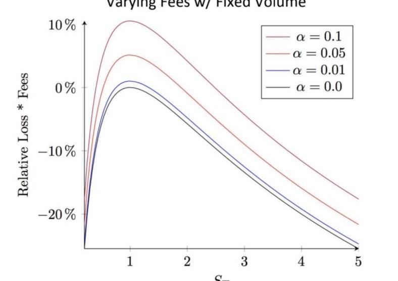 在Uniswap中,無常損失是如何與費用成比例縮放的。來源:CharlieNoyes也就是說,更專業的做市商可以更聰明地對資產進行定價,這就給了他們降低費用的空間。隨著時間的推移,AMMs的競爭越來越激烈,費用將不可避免地被壓縮。始終如一的報價