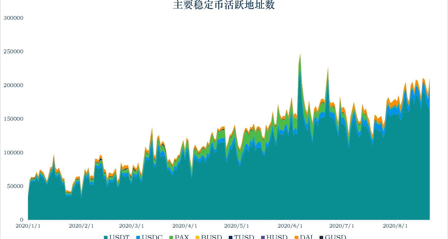 來源:MYKEY,CoinMetrics過去一周,Tether將10億USDT由Tron遷移至以太坊,另外在以太坊上增發了1.2億USDT,在Tron上增發兩次共4億USDT。USDC、PAX、BUSD、TUSD、DAI、GUSD的流通量分別增發1.34億、259萬、434萬、7999萬、1987萬、14萬,HUSD的流通量減少128萬。持幣地址數