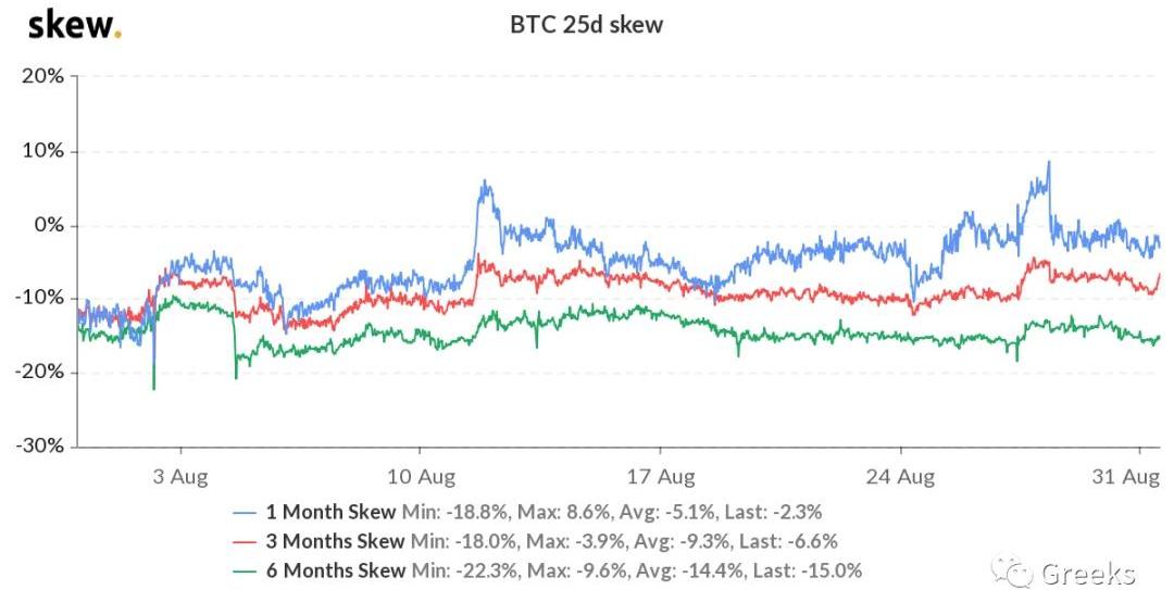 BTC歷史波動率10d36%30d47%90d47%1Y80%期權持倉量12億美元,期權成交量1.07億美元,比特幣上漲到11700美元。各標準化期限隱含波動率:今日:1m53%,3m65%,6m71%8/30:1m52%,3m67%,6m72%IV變化不大,目前各期限的IV已經穩定了近一周。