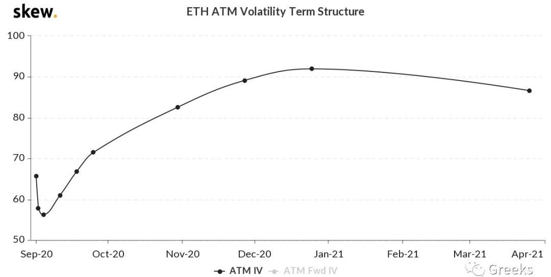 各標準化期限IV:今日:1m73%,3m88%,6m90%8/30:1m74%,3m90%,6m90%以太坊的價格雖然上漲了很多,但是IV仍然處在下降趨勢,期限結構很平滑,大家對于以太10%以內的波動已經不當一回事了。