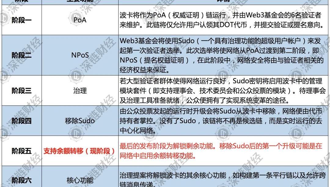 波卡主網啟動的6個階段波卡主網有一個分階段推出的計劃,每個階段都有重要的里程碑。這六個階段的內容為:PoA,NPoS,治理,移除Sudo,啟用轉賬和核心功能。目前已開啟余額轉賬,全功能主網即將到來。那么我們就會有個疑問,為什么DOT之前不能夠轉賬,交易所里卻已經可以交易DOT代幣。其實這是早期用戶通過募資獲得的代幣,比如第一次荷蘭式拍賣1400多個參與者的代幣被鎖定在以太坊鏈上,在還未開啟轉賬時,就可以將ERC-20的代幣通過映射轉換為主網代幣,因此無需擔心,支持DOT映射的交易所里面的都是真幣,而且有些交易所已支持充提。從一鍵發幣到一鍵發鏈的時代