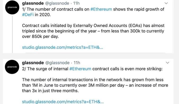 1、DeFi增長推動以太坊智能合約調用數量激增,三個月飆漲3倍Glassnode9月3日發推稱,隨著DeFi在2020年的快速增長,以太坊網絡上的智能合約調用數激增。自今年年初以來,由外部賬戶發起的合約調用數量幾乎增加了兩倍,從每天不到30萬次增加到目前的85萬次以上。內部以太坊合約調用數量則是從6月份的不到100萬,增加至目前每日超過300萬,在短短三個月內增長了3倍以上。在以太坊網絡上,智能合約的每一步運行都需要被調用執行,當整個活躍度增加,調用次數也會增加。當然,近期以太坊網絡上所有鏈上數據都在增加,例如以太坊鏈上錨定BTC的代幣總量升至57000枚,約合6.8億美元,也創下了歷史新高;以太坊網絡上礦工手續費收入也創下歷史新高,達到2300萬美元。