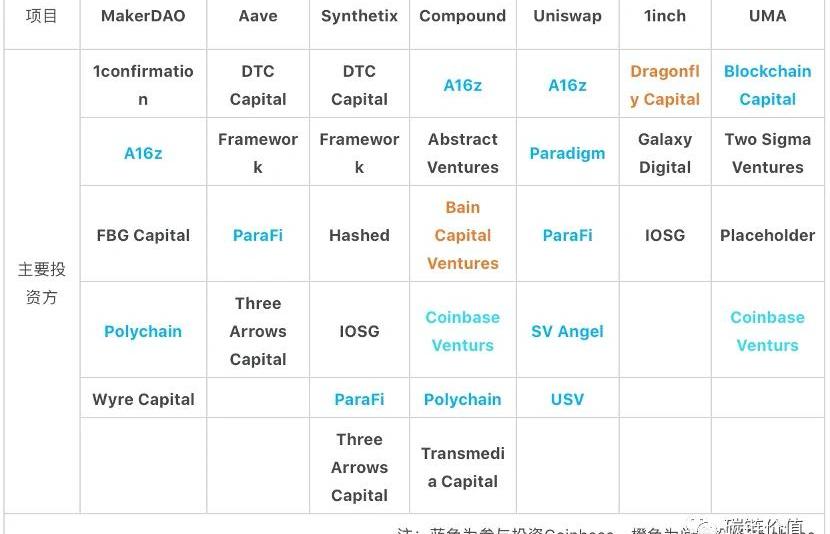 與此同時,碳鏈價值發現,知名DeFi項目都或多或少與Coinbase或其背后的資本有聯系。從總鎖倉量、交易量、代幣市值分別選出前幾的項目,作為樣例分析。總鎖倉量:MakerDAO、Aave、Synthetix、Compound交易量:Uniswap、Curve、1inch、Balancer代幣市值:LINK、LEND、UMA、SNX作為DeFi王冠項目的MakerDAO,其主要投資者包括了A16z、Polychain、FBGCapital、WyreCapital、1confirmation。因「閃電貸」攻擊而聞名的無抵押借貸Aave的主要投資為ParaFi、Framework、ThreeArrowsCapital、DTCCapital。第三個總鎖倉過10億美元的合成資產發行協議Synthetix的主要投資者包括ParaFi、IOSG、FrameworkVentures、DTCCapital、Hashed、ThreeArrowsCapital。日交易量曾一度達到了Coinbase三分一的去中心化交易所Uniswap的投資方主要包括Paradigm、a16z、USV、ParaFi、SVAngel。剛上線時市值一度超過以太坊的Curve并未透露其投資者,因此不在統計范圍。1inch的主要投資者為GalaxyDigital、IOSG、DragonflyCapital。Balancer的主要投資者是Placeholder。預言機Chainlink的募資方式為ICO,因此也不在考慮范圍。去中心化合成資產協議UMA的主要投資者為Placeholder、BlockchainCapital、CoinbaseVentures、TwoSigmaVentures。