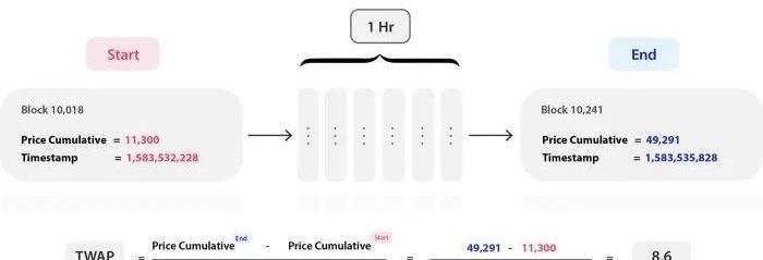 Uniswap的價格信息傳輸機制可以讓開發者基于某個代幣在幾個區塊內的價格波動性來計算該代幣的平均價格。這個時間區間可以是前1小時,前24小時乃至更久。雖然Uniswap會提供代幣價格,但是它不會在鏈上存儲任何歷史價格。需要dApp開發者自選基于一段時間的累積價格,來計算某個代幣在這段時間的平均價格。這些平均價格稱為時間加權平均價格。所謂的TWAP就是在鏈上選定一段區塊作為時間區間,將某個代幣在這段區塊內的累積價格除以時間戳區間,得出該代幣在這段區塊的平均價格。圖解如下: