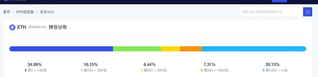 歐科云鏈OKlink數據顯示,目前ETH持倉前300名,掌握了總計50.14的ETH,環比下降0.78%;整個持倉分布呈現橢圓形結構,各個部分占比分別是:第1~100名,占比34.99%,環比上漲0.29%;第101~300名,占比16.15%,環比下降0.07%;第301~500名,占比6.44%,環比下降0.08%;第501~1000名,占比7.31%,環比下降0.07%;第1001名后,占比35.13%,環比下降0.08%。三、生態與技術