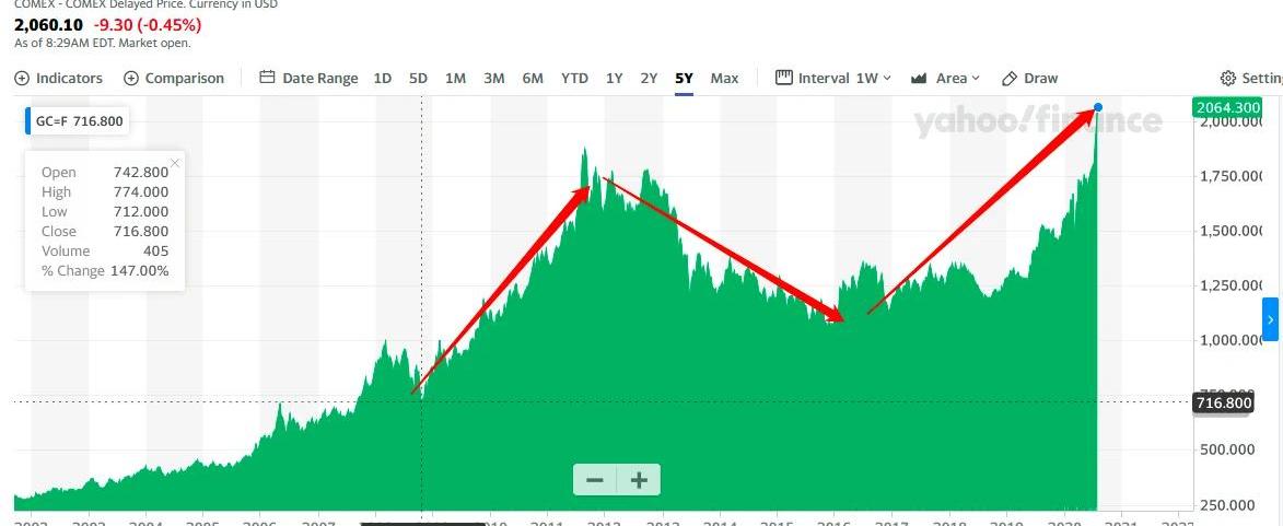 比特幣、黃金、標普500指數52周相關性隨著這種關系的日益密切,比特幣的價格走勢,很可能會與2008年金融危機后的黃金的價格走勢相似,但漲幅必然更大。那么,黃金價格走勢到底是怎樣的呢?回顧歷史,2008年全球金融風暴席卷而來之時,資產價格普遍暴跌,但從黃金價格卻從2008年10月的682美元升值至2011年9月的1912美元,漲幅超過180%。
