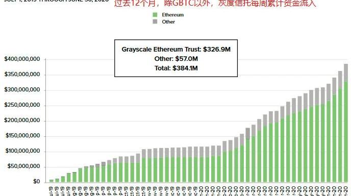 過去12個月,GBTC每周累計流入量4)2020年Q2,除GBTC之外,灰度投資品的需求增長至1.547億美元,環比增長35%,較2019年Q2增長超過649%。這一增長主要是由于ETHE在Q2流入的1.352億美元所致,這也使得過去12個月的GBTC以外的資金流入達到3.841億美元。2020年Q2,除GBTC以外,灰度信托每周累計資金流入。