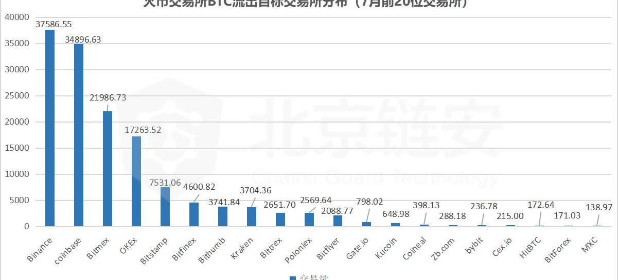 Huobi流出的比特幣主要去向中,Binance、coinbase、Bitmex位居前三,幣安在火幣交易所流出的比特幣去向中繼續占據第一,相較于6月,火幣流向幣安的比特幣數量上漲了73.90%。