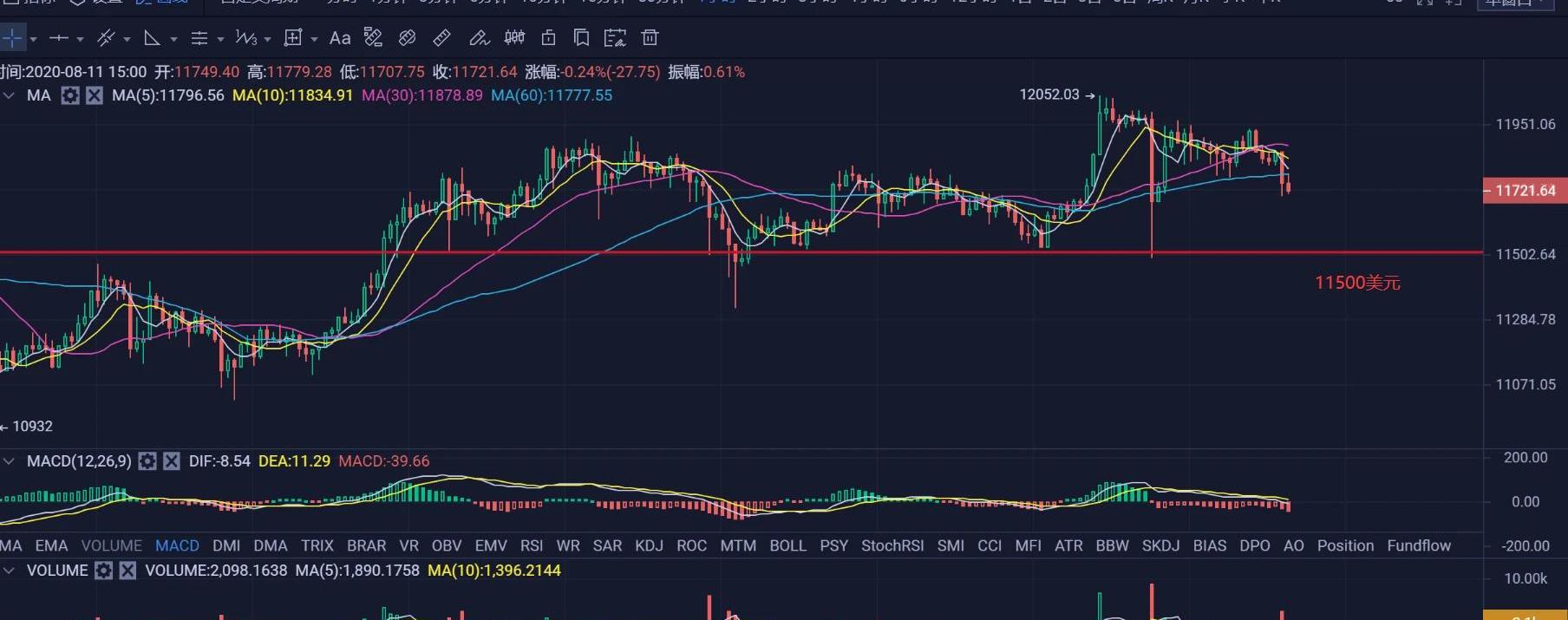 整體節奏問題不是很大,除非黃金真的崩盤,否則比特幣最多還是在高位震蕩調整一下。而且近端時間有三次面臨12000美元都回落,可以看做是該關口壓力實在是比較大,一時難以突破,但看后續回落的情況,回落的低點位置在抬高,也在反復沖擊該位置,說明當前下方托盤的力量也是比較足的,一旦宏觀因素影響變小的話,看好行情會更進一步。從小時線級別看,近期真的要感謝11500這個關口,近五個交易日,起碼支撐住了三波的行情回落,所以當下回調時的第一支撐位置還是關注11500美元。