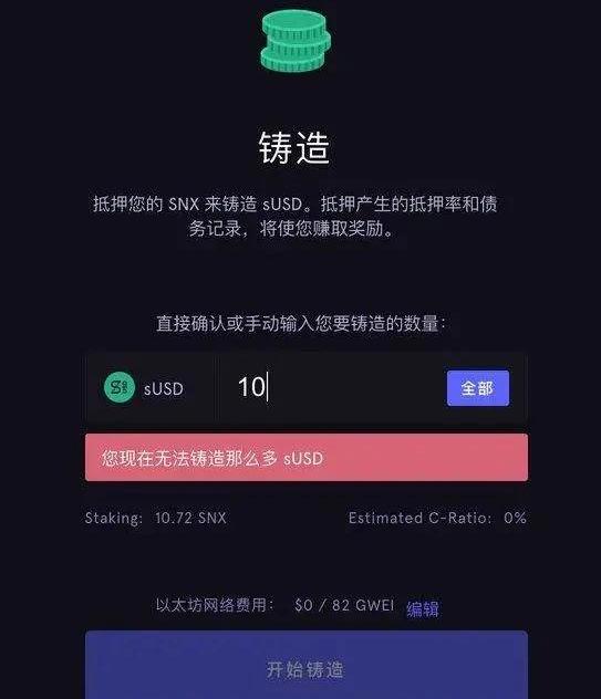 合成資產的創建實際上,Synthetix并不能讓用戶直接創建全部的合成資產類型,而是分為兩步:通過Mintr平臺(https://mintr.synthetix.io/),用戶超額抵押Synthetix平臺代幣---SNX(SynthetixNetworkToken)作為擔保物,能夠鑄造出sUSD穩定幣。目前的標準抵押率是700%,也就是說抵押7美元價值的SNX,才能創建1美元的sUSD。這么設計是因為,畢竟SNX沒有那么強的價值共識,設置高額抵押率,降低抵押物價值不足的風險。使用鑄造出來的sUSD穩定幣,在Synthetix的交易平臺(Synthetix.exchange)上,交易合成資產。事實上sUSD購買合成資產的過程,也是這類合成資產鑄造的過程。此時銷毀了sUSD,創建了對應的合成資產。
