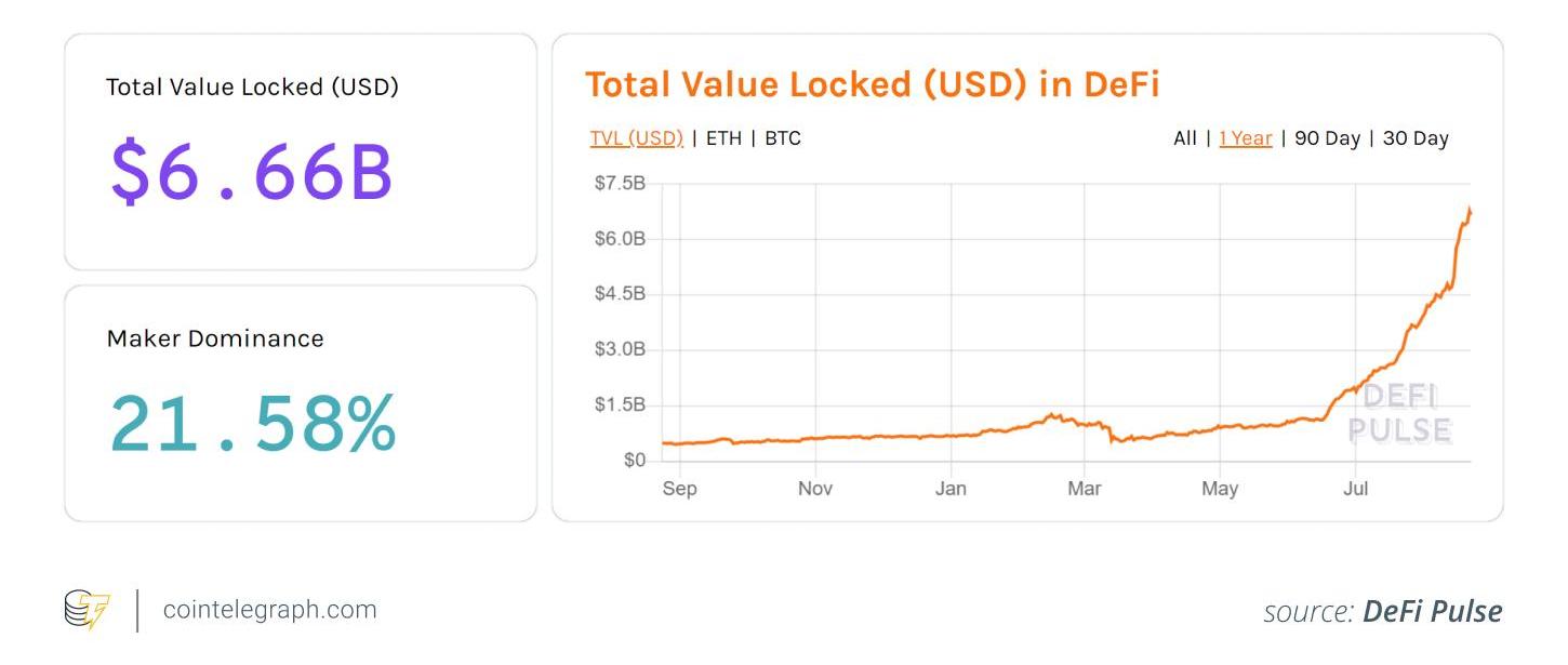 當市場的增長速度與DeFi市場一樣快時,市場可能難以保持平衡。當被問及DeFi是否正在鼓吹泡沫時,FrostBrownTodd有限責任公司的律師JohnWagster告訴Cointelegraph:“DeFi鎖定的總價值從5月份的大約10億美元迅速增加到今天的60億美元,當然這可以被視為一個市場過熱的跡象。”但是,他還表示:“收益耕作的真正創新概念來自于聰明的工程,這些工程似乎吸引了尋找新機會的市場參與者。”