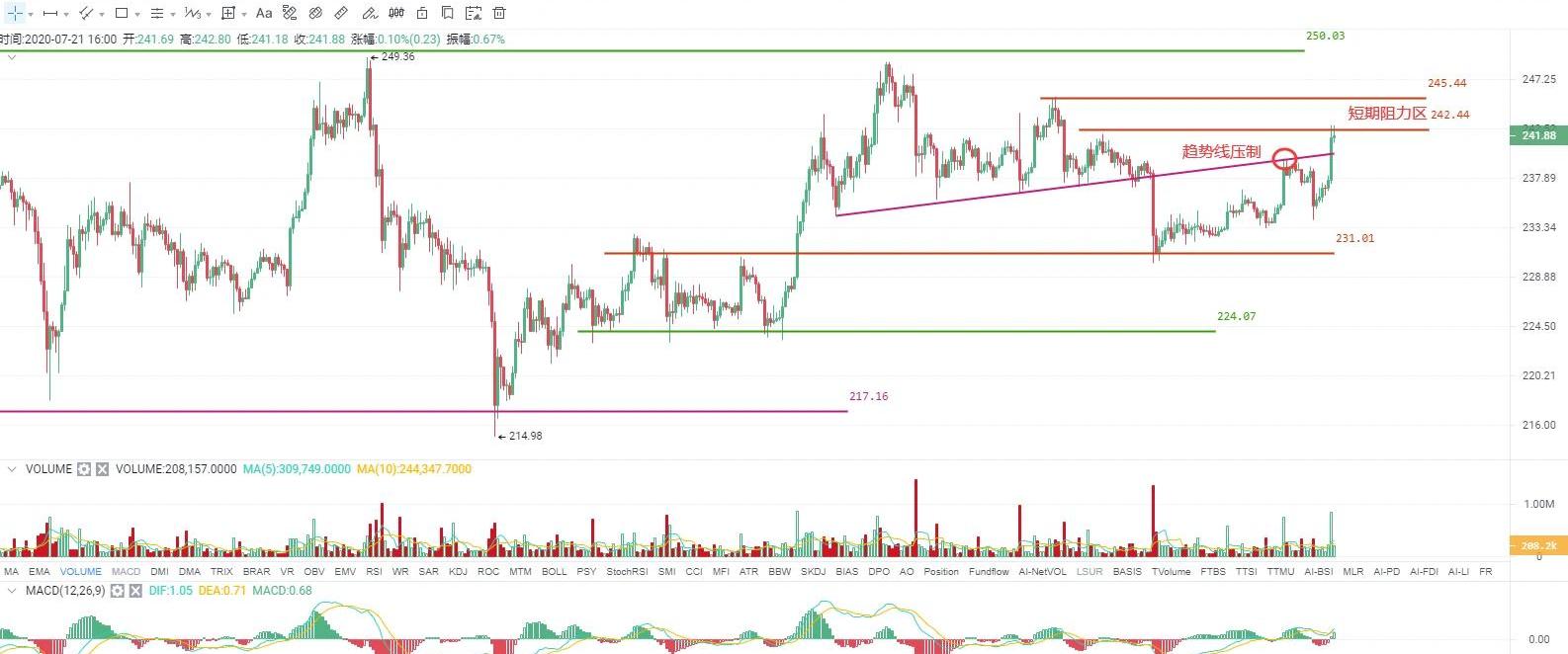 各級別性質:日線-盤整,4小時-盤整,1小時-上漲截圖來自OKEXETH/USDT永續合約2小時圖:目前的客觀走勢及應對策略:如圖所示,昨天幣價的高點剛好就是之前的那條趨勢線支撐,再跌破后變成了壓力線,昨天我們給的重要壓力也參考這這條線。當市場出現類似信號時去博弈遠比你憑感覺去做單的成功概率高的多。目前幣價走勢跟隨BTC向上反彈,不過在我們昨日所畫的242一線阻力位已經出現受阻跡象,這個阻力從級別上并不算是什么特別強的阻力,從側面說明這個反彈的能量并不是很強。建議接下來不要對幣價進一步上漲的空間估計過高而盲目重倉追漲,可關注242-245阻力區間,如果幣價進入該區域后出現明顯滯漲或是不錯的逢高做短線空單的機會。主觀預期:預估幣價再次小幅上漲至靠近245附近位置出現受阻回落,回落幅度不會太大,關注237附近支撐位。本段作為交易策略參考。阻力與支撐阻力:242--245--250支撐:240--237--234EOS/USDT永續合約