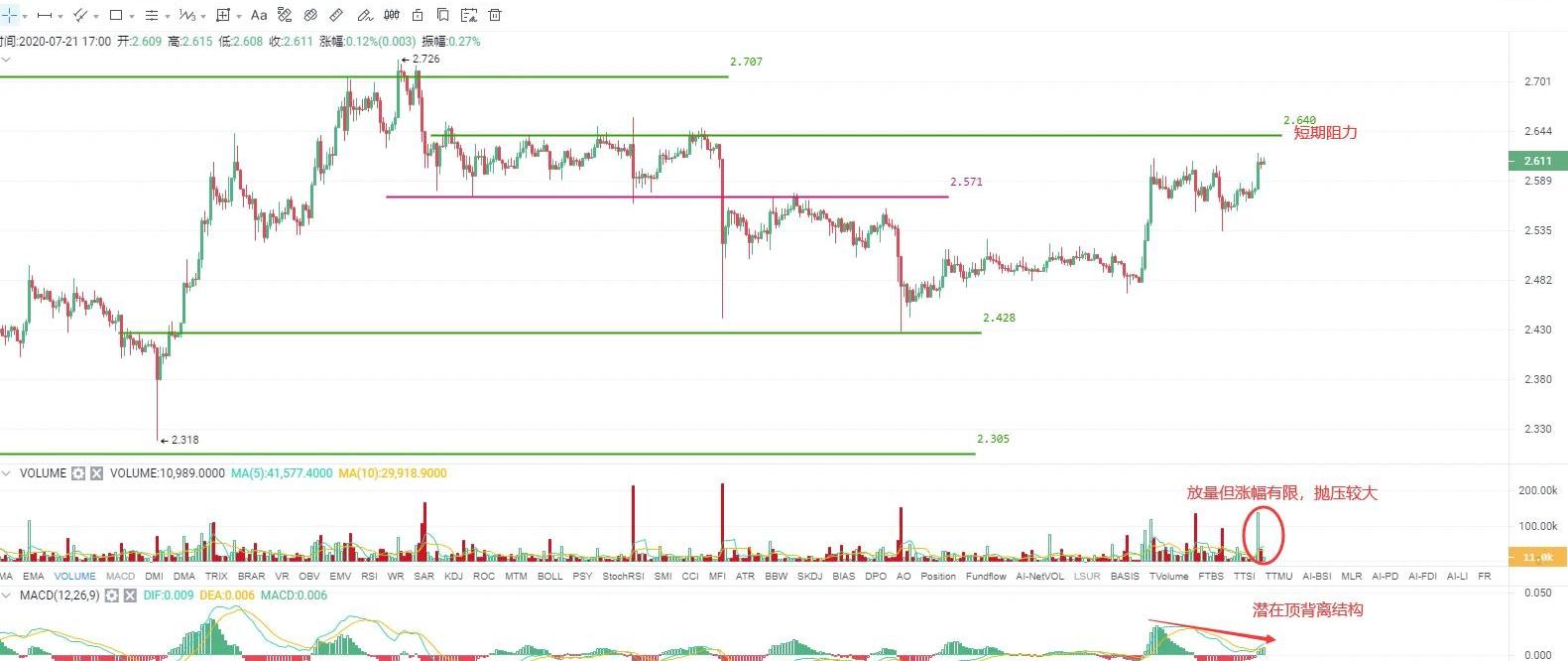 各級別性質:日線-下跌,4小時-盤整,1小時-上漲截圖來自OKEXEOS/USDT永續合約1小時圖:目前的客觀走勢及應對策略:EOS雖然也跟隨比特幣走出反彈,但明顯力度要弱很多。昨天凌晨的那輪拉升還是明顯強于比特幣的,這塊就風格轉換,這反應的是當前市場的資金面并不充裕,風格轉換快,操作難度也就更大,在操作時要更加注重風控。從目前的走勢看,短線反彈結構延續的概率較大,不過在MACD指標上開始出現一絲絲頂背離跡象,再加之成交量明顯放大后漲幅有限,說明上方的拋壓盤較多。如此來看,建議也不呀對后續的反彈延續空間抱有過高預期,需要重點留意2.64-2.70區域阻力,若進入該區域容易再次引發價格短期頂部形成,可關注這種潛在短線交易機會。注意,現在所看到的都是偏短線的機會,不要過分“加戲”。下方支撐重點關注2.56一線即可,若跌破則大概率提前轉弱。主觀預期:預估在靠近2.64或小幅度上破后形成短期頂部展開調整,是否能展開較大的回調則要看2.56是否破位,破位易引發較大調整。本段不作為交易策略參考。阻力與支撐阻力:2.64--2.70--2.80支撐:2.57--2.48--2.42免責聲明:本專欄內容概不構成任何投資意見,內容亦并非就任何個別投資者的特定投資目標、財務狀況及個別需要而編制。投資者不應只按本專欄內容進行投資。在作出任何投資決定前,投資者應考慮產品的特點、其本身的投資目標、可承受的風險程度及其他因素,并適當地尋求專業意見。