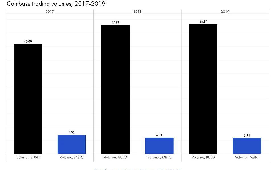 資料來源:BQIntel從上圖來看,Coinbase從2017年到2018年的收入大幅下滑是由于比特幣的貶值和客戶群的萎縮。早期風險投資公司TribeCapital收集的數據也證實了這一點,數據顯示,2017年12月至2018年9月期間,Coinbase在美國的所有月度活躍用戶下降了約80%。Coinbase最終確實在2019年實現了一定程度的穩定發展。根據從bitcoinity檢索到的數據,以美元計算的交易量持平,以比特幣計算的交易量下降了3%。