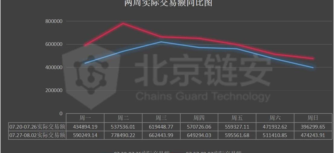 XRP/HKD+1.02%北京鏈安,聚焦區塊鏈安全與數據服務,以下是基于北京鏈安ChainsMap鏈上數據監測系統,就上周數據發布的比特幣鏈上數據周報。從過去一周數據來看,隨著比特幣價格接連突破關鍵位置,甚至沖上1.2萬美元,鏈上大多核心數據也出現明顯增長。交易額:07.20-07.26:6284846.09BTC07.27-08.02:7364265.53BTC較之前一周上漲:17.17%詳細數據圖如下: