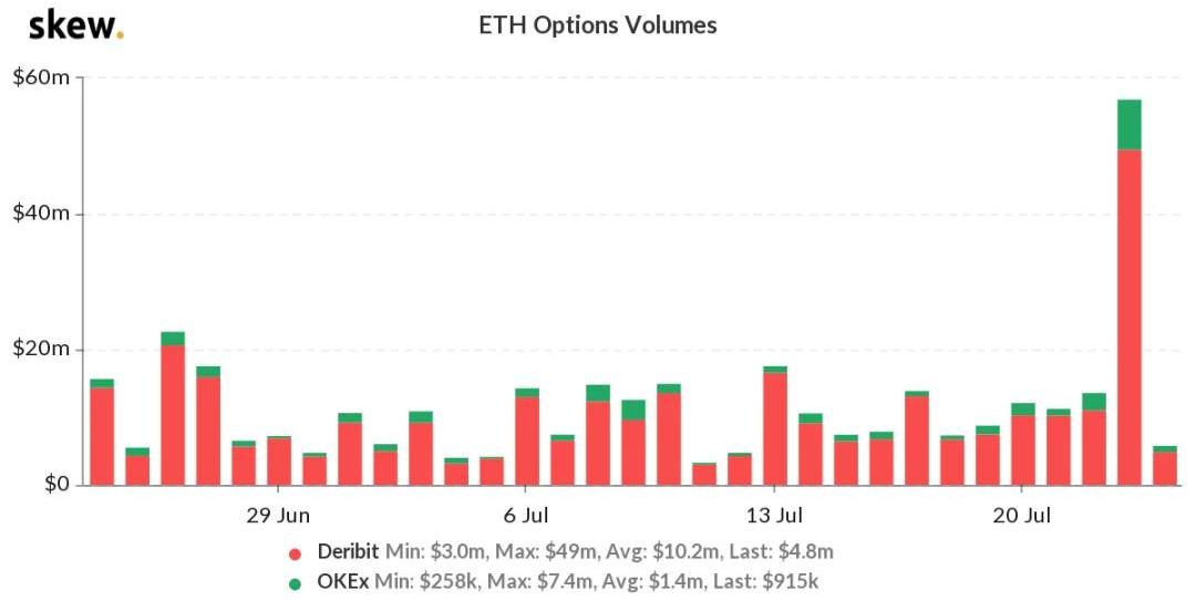 XRP/HKD+2.15%比特幣的IV在周五再次下跌,甚至低于上漲前的水平。以往以太坊的走勢多多少少跟隨比特幣,但是這次有所不同,以太坊引領了這波行情。特別是期權市場迎來爆發,以太坊期權單日交易量創造歷史新高,是前高的近兩倍。持倉量也達到2.25億美元,是前高的150%。本播報由Deribit和Greeks.live聯合推出。
