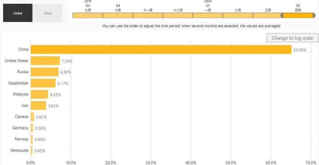 作為全球比特幣礦業的中心,全球70%以上的比特幣算力一度都位于中國。然而,近一年來,這個數字出現了明顯變化。劍橋大學替代金融中心數據顯示,中國比特幣礦場的算力占比,已經由2019年9月的75.62%,下降至2020年4月的65.08%。而同期,美國礦場的算力由4.06%增加至7.24%,哈薩克斯坦算力由1.42%增加至6.17%。俄羅斯、馬來西亞、伊朗的比特幣算力也在持續增長,并開始瓜分中國的份額。