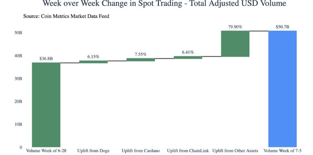 本周現貨交易量有一個約為139億美元,或近38%的提升。考慮到BTC和ETH過去一直在低波動范圍內交易,這個數據是很亮眼的。低波動率通常與低交易量相吻合,但在過去一周哪,幾個關鍵山寨幣的投機活動推動了交易量的上升。在本次分析中,我們將特別關注以下三個:Doge,Cardano和ChainLink.它們合計占了本周漲幅的20%。
