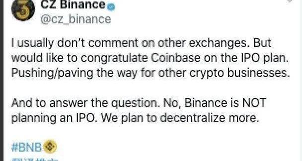 目前來看,基于區塊鏈的IPO不太可能,不過非常規的確有體現。而據路透社報道,Coinbase正在探索在今年晚些時候通過直接上市的方式,而不是傳統的IPO方式進行。其實不管是首次公開募股還是直接上市,只不過是公司通上市來籌集資金的兩種不同方法。許多公司選擇進行首次公開募股的方式來創建,承銷和出售新股,但有些公司選擇直接上市,不創建任何新股,而只出售現有外流通股。沒有承銷商參與。美國線上流媒體平臺Spotify就在2018年選擇直接上市。對于Coinbase上市的消息,幣安CEO趙長鵬在推特發來賀電表示:我通常不對其他交易所發表言論,但這次還是要祝賀Coinbase的IPO計劃,同時也為加密業務推波助瀾。