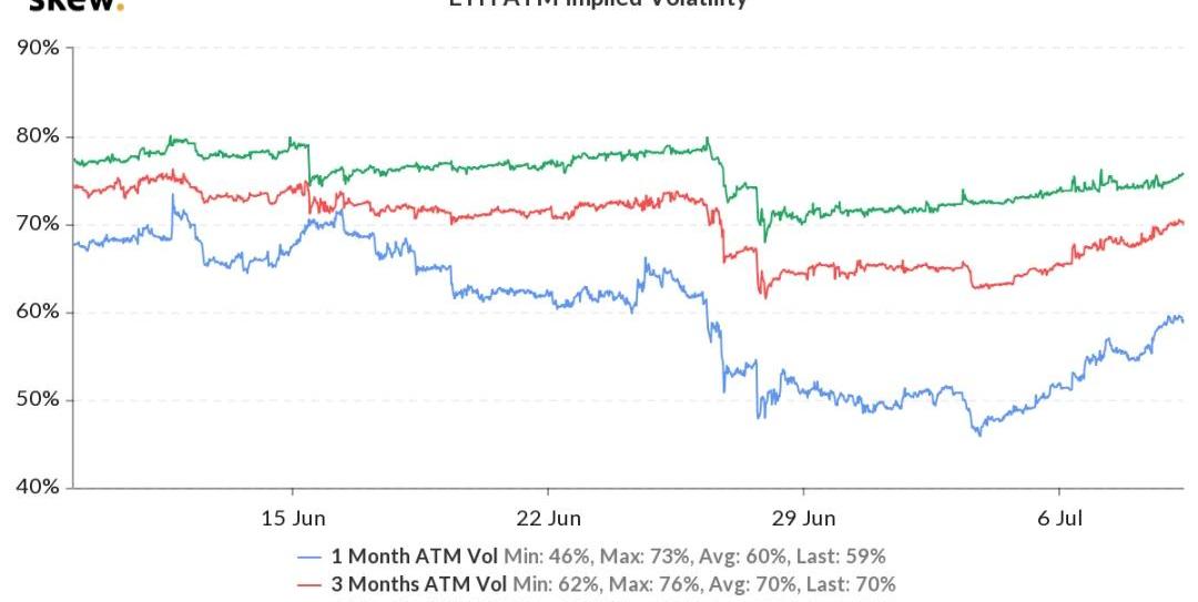 持倉量1.54億美元,持倉量上升,已經接近季度交割前的持倉量。交易量和昨天相比小幅上升。各標準化期限IV:今日:1m59%,3m70%,6m76%7/8:1m56%,3m68%,6m75%中長期隱含波動率相對平穩,短期隱含波動率明顯上升。