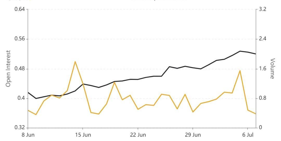 持倉量1.46億美元,持倉量平穩。交易量和昨天相比小幅上升。各標準化期限IV:今日:1m56%,3m68%,6m75%7/7:1m57%,3m68%,6m75%中長期隱含波動率相對平穩,短期隱含波動率明顯上升。