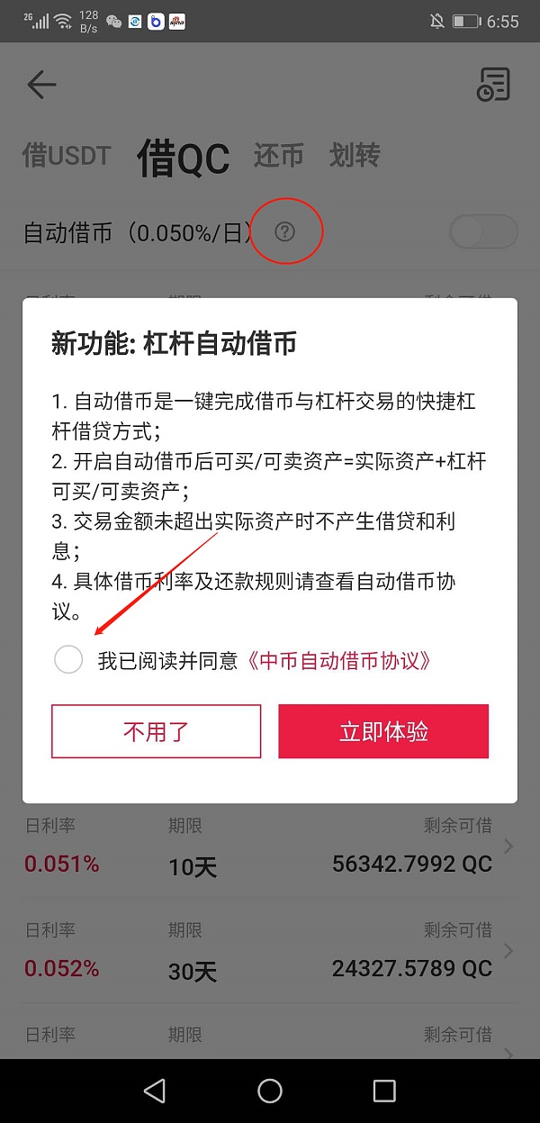 2、在借幣頁面中點擊“?”,閱讀《中幣自動借幣協議》后開啟自動借幣。